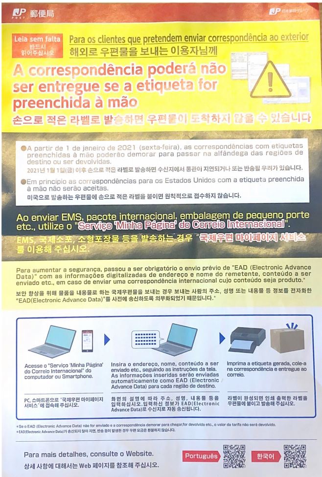 2021년 1월 1일 부터는 손으로 적은 라벨로 발송하면 수신지에서 통관이 지연되거나 또는 반송될 우려가 있습니다